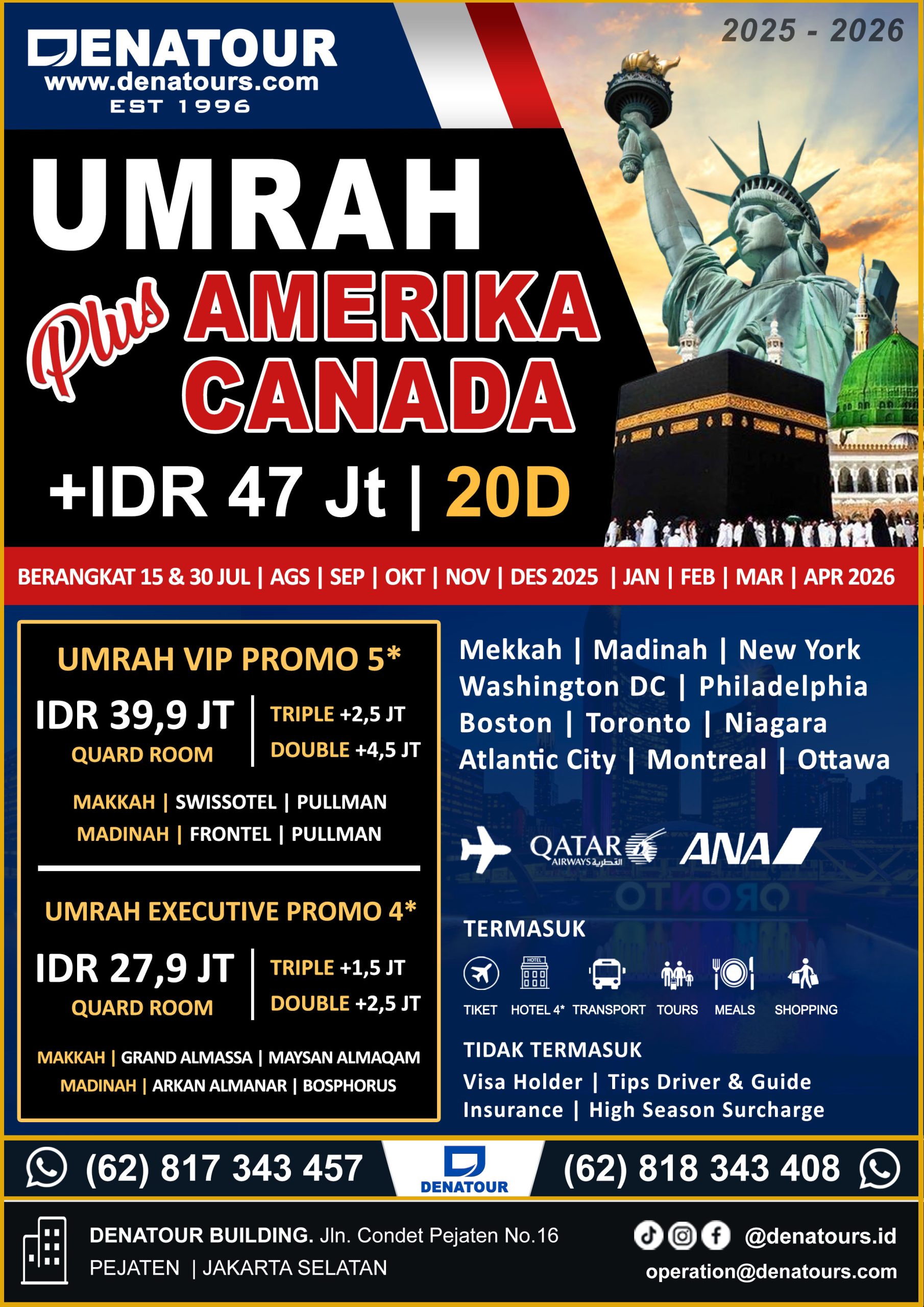 Jangan ragu untuk bergabung dengan Denatour dalam perjalanan umroh dan wisata ke Amerika dan Canada. Program ini akan memberikan pengalaman yang unik dan berbeda dari program umrah biasa. Kombinasi antara ibadah dan wisata di negara Amerika dan Canada membuat program ini semakin menarik bagi para calon jamaah.